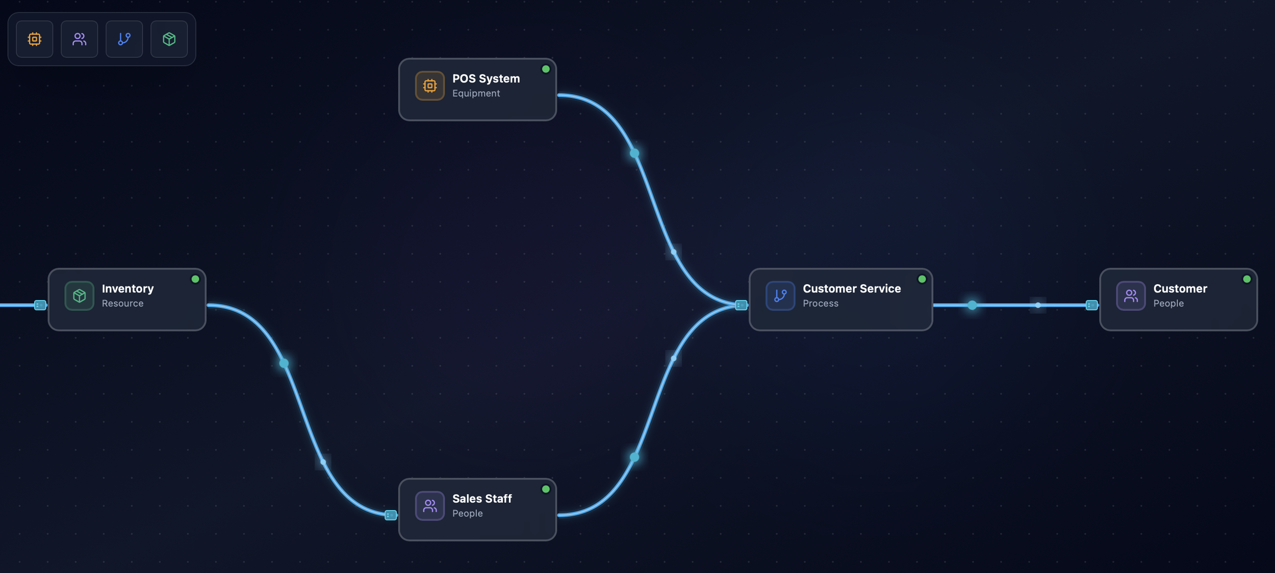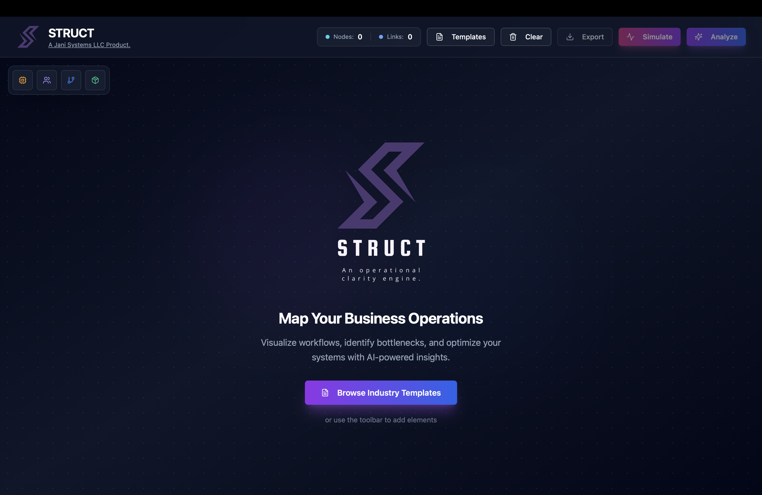 STRUCT is an intelligent visualization and analysis platform designed to help organizations understand, optimize, and strengthen their operational ecosystems. Within the app, users can create comprehensive, real-time maps of their business by connecting nodes that represent critical elements such as equipment, personnel, processes, departments, and resources.